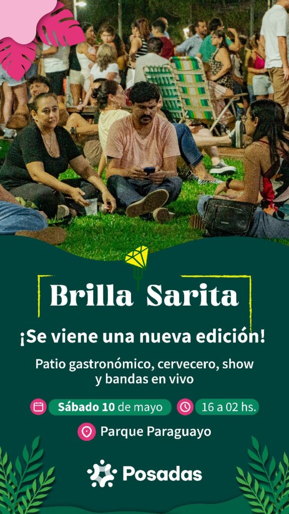 Este sábado 10 de mayo, el Parque Paraguayo será nuevamente escenario de la convocante feria “Brilla Sarita”, un evento que ya se consolida como emblema de la agenda posadeña. Desde las 17:00 hasta las 02:00, vecinos y visitantes podrán disfrutar de una jornada cargada de sabores, arte, música en vivo y propuestas pensadas para toda la familia.