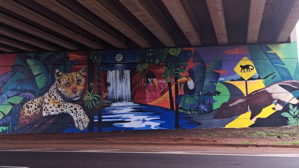 Garibotti, quien reside en Candelaria y está al frente del emprendimiento Tinte Urbano, empezó a pintar murales en 2003, en la provincia de Buenos Aires. Llegó a Misiones hace unos 15 años y siguió conectada con el muralismo. La mayor parte de sus trabajos son colaborativos. Distintos actores de la comunidad se suman. Es lo que sucedió en el Nodo Posadas-Garupá, un proyecto de Vialidad Nacional en articulación con la Dirección Provincial de Vialidad, la Secretaría de Estado de Cultura, Energía de Misiones, el IFAI y representantes del sector privado, como la empresa de transportes Crucero del Norte. Muchas manos de Posadas, Garupá y Candelaria pusieron color a esos muros, desde los cuales carpinchos, ciervos, aves y un majestuoso yaguareté les recuerdan a los automovilistas que deben respetar las velocidades máximas para cuidar la rica fauna misionera.