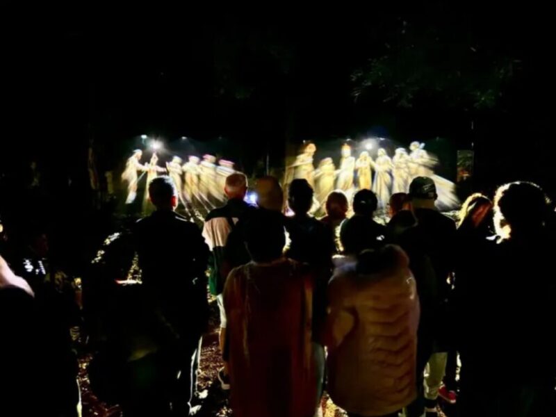 Durante 45 minutos, la historia cobra vida en medio de la naturaleza, con el cielo despejado y la luna acompañando el recorrido, mientras las imágenes se funden con el relato del cacique que guía a los visitantes.