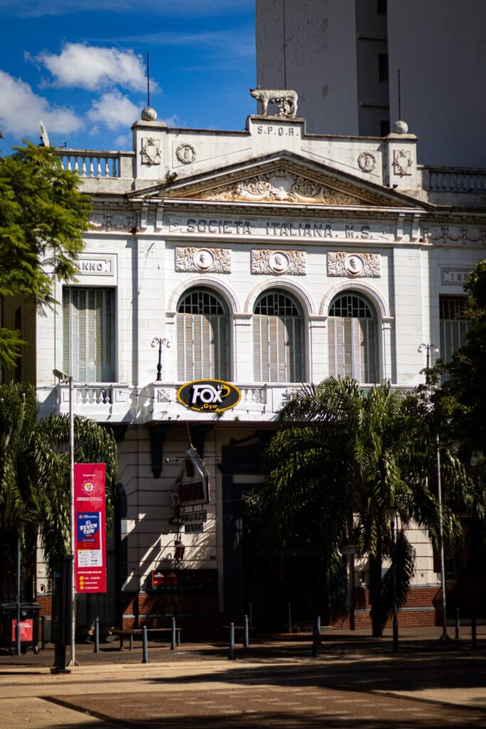 El edificio de la Sociedad Italiana representa a un estilo renacentista y neoclásico. Sobre todo, desde lo alto con la réplica de la escultura de la mítica loba Luperca que amamanta a Rómulo y Remo. A sus pies resalta la sigla latina SPQR -Senātus Populusque Rōmānus-, en español significa “El Senado y el Pueblo Romano”.
