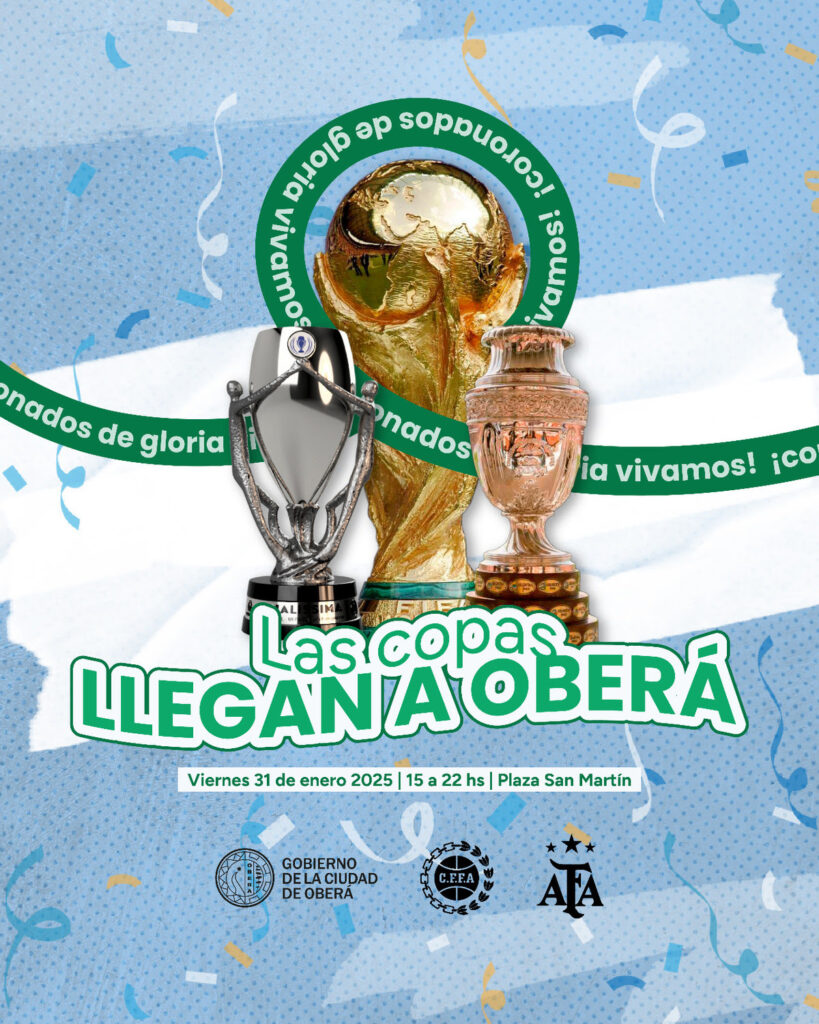 El viernes 31 de enero en la plaza San Martín, estarán exhibidas la Copa América 2021/2024, la Finalíssima 2022 y la Copa del Mundo 2022. El horario será de 15 a 22 horas y en caso de lluvia se expondrá en el complejo deportivo Ian Barney.