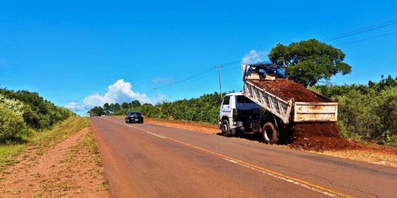Por otro lado, en San Vicente, equipos de la DPV trabajan en el mantenimiento de las banquinas de la Ruta Provincial N° 13, el equipo avanza hacia El Soberbio.