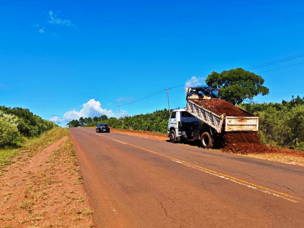 Por otro lado, en San Vicente, equipos de la DPV trabajan en el mantenimiento de las banquinas de la Ruta Provincial N° 13, el equipo avanza hacia El Soberbio.